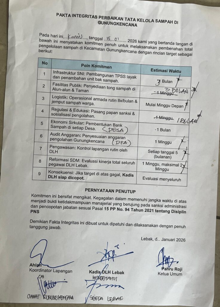 “Kami memohon maaf atas kendala pada aksi sebelumnya. Komitmen kami jelas: kami akan segera menetapkan titik TPSS yang sah agar pengangkutan sampah memiliki landasan hukum yang tetap dan tidak lagi menjadi titik abu-abu di wilayah Gunungkencana,” tandas Irvan.